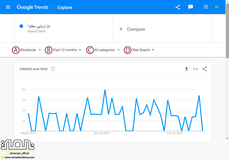 A میتوانید از این بخش، یک ناحیه مشخص را انتخاب کنید تا سطح تمایل صرفا در یک محدوده جغرافیایی سنجیده شود یا روی گزینه worldwide بگذارید، تا همه مناطق در بررسی شما لحاظ شوند.
