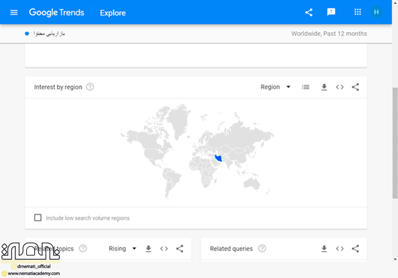 در ادامه یک نقشه به شما نشان داده می شود که میزان محبوبیت عبارت جستجو شده را در مناطق مختلف به شما نمایش می دهد. که اگر شما گزینه worldwide را انتخاب کرده باشید میزان محبوبیتت در کشورهای مختلف و اگر یک کشور را انتخاب کرده باشید میزان محبوبیت در استان های متفاوت آن کشور را نمایش می دهد، که در ادامه هر دو حالت به شما نمایش داده می شود.